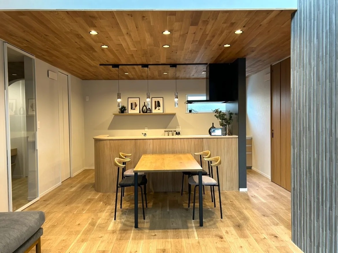 キッチンの腰壁は、造作でR壁に木調パネルを使用しています。